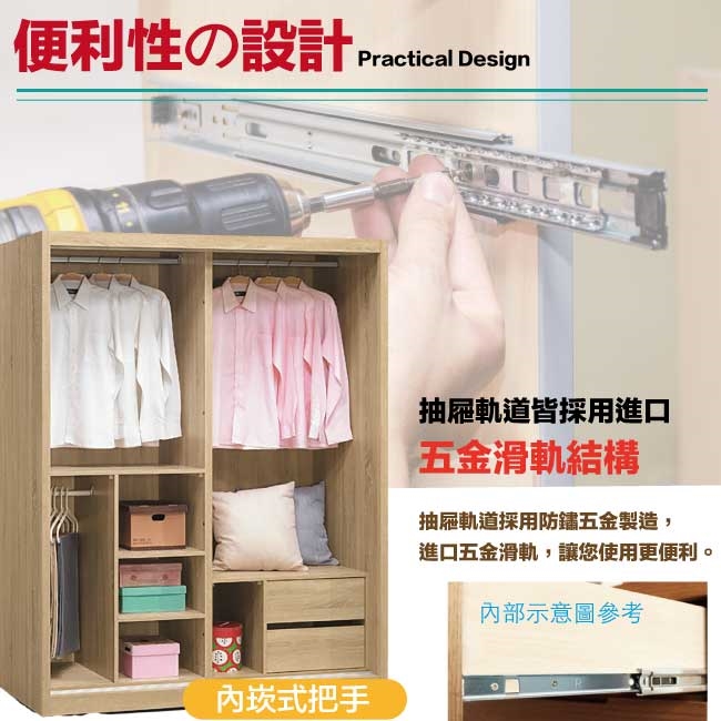 採用開門櫃+吊衣桿+二抽屜+內開放式收納等收納空間設計