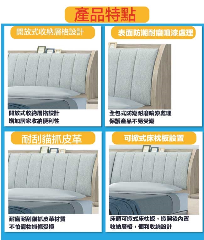 搭配採用床頭箱可掀式床枕板+內外開放層格等收納空間設計