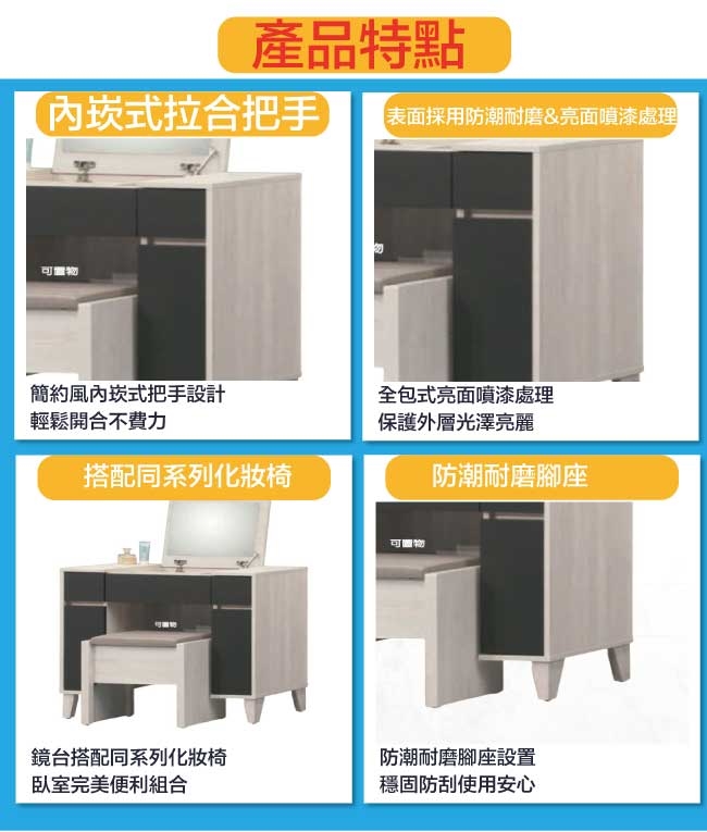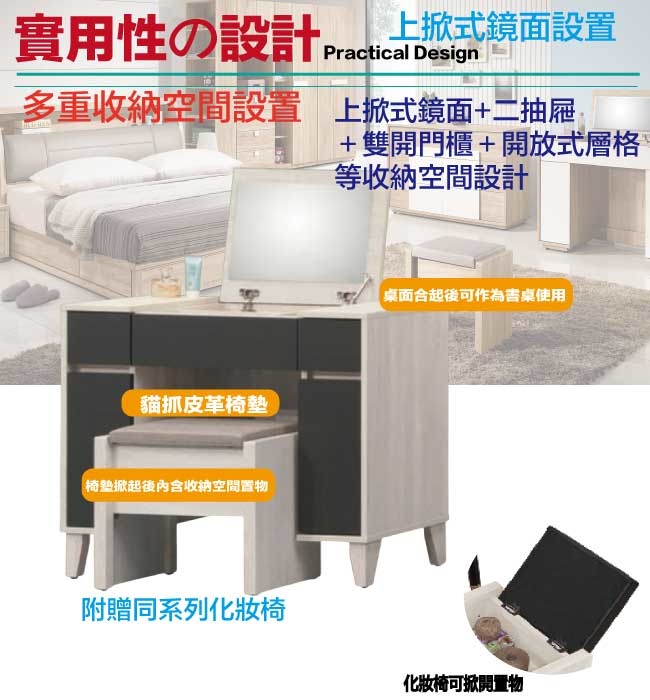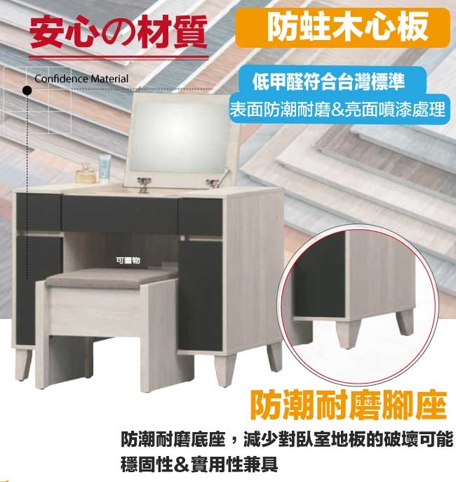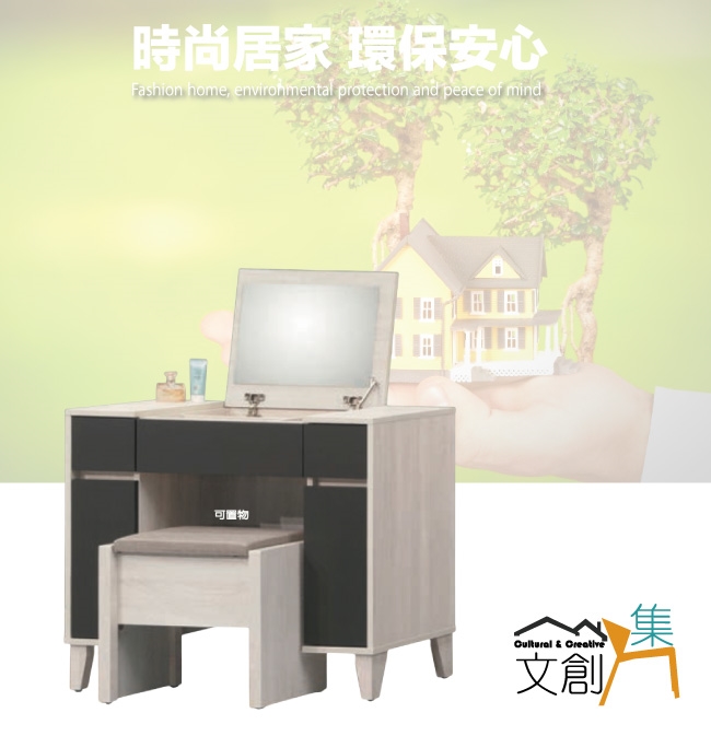 【文創集】范德雙色3尺上掀式鏡面化妝台/鏡台組合(含化妝椅) 木紋雙色系+現代簡約風格+安心材質製造,使用放心+搭配居家更便利,整體採用防蛀木心板+防潮耐磨腳座+五金滑軌結構+強化玻璃鏡面等材質搭配外層採用優莉坦耐磨全包式噴漆處理 ,採用上掀式鏡面櫃+二抽屜+開門櫃+開放式收納等收納空間設計,全由專人配送到家,專業安心服務,替你省下更多時間!