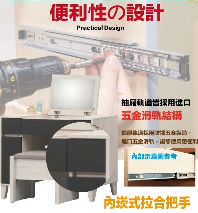 防蛀木心板+防潮耐磨腳座+五金滑軌結構+強化玻璃鏡面等材質