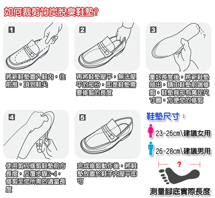 1、使用時,若舊鞋墊可取出請先取出,再放入本鞋墊,可增加穿著之效果。