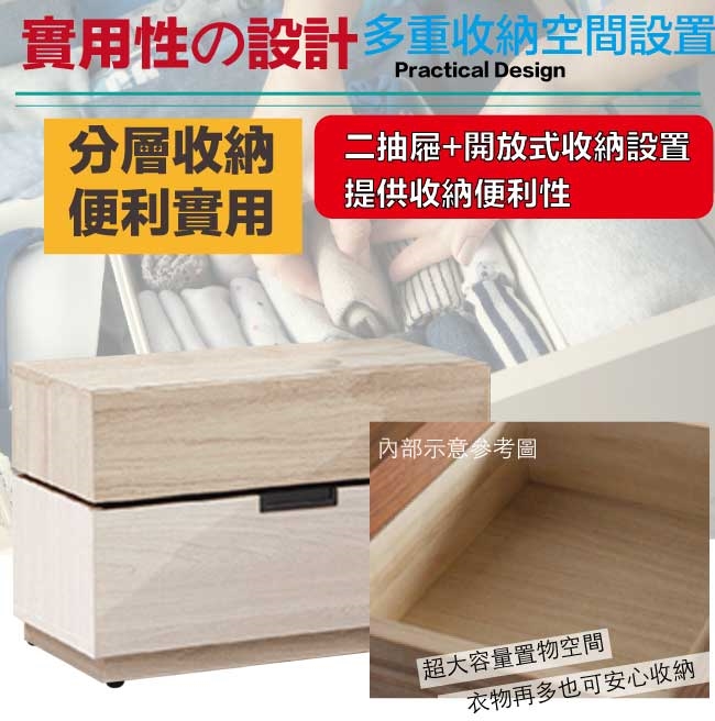 採用二抽屜+開放式空間等收納空間設計