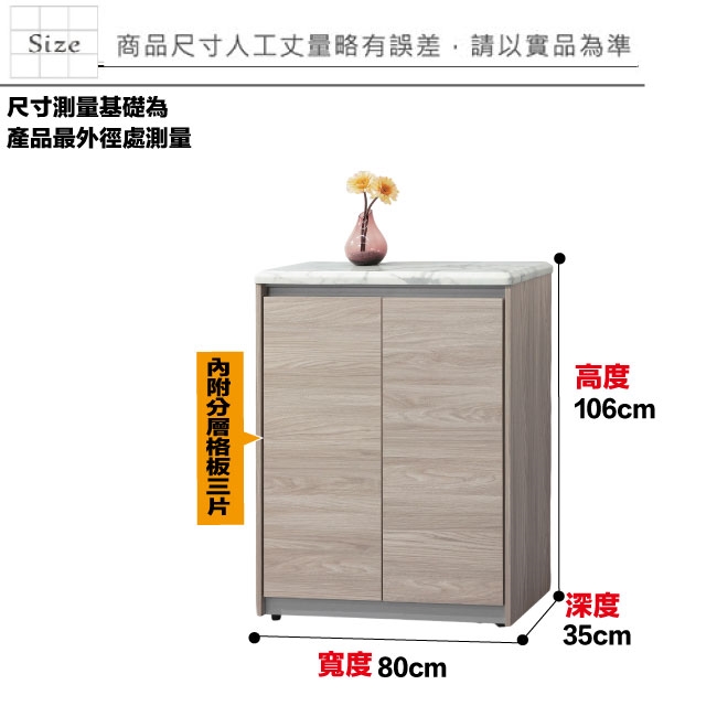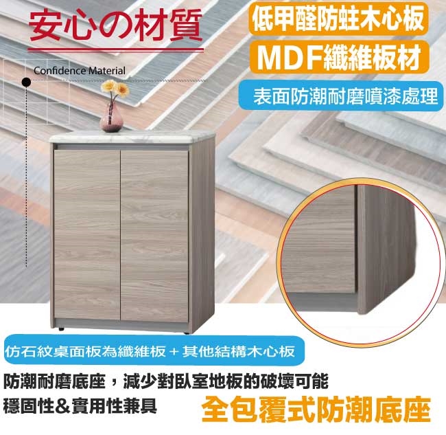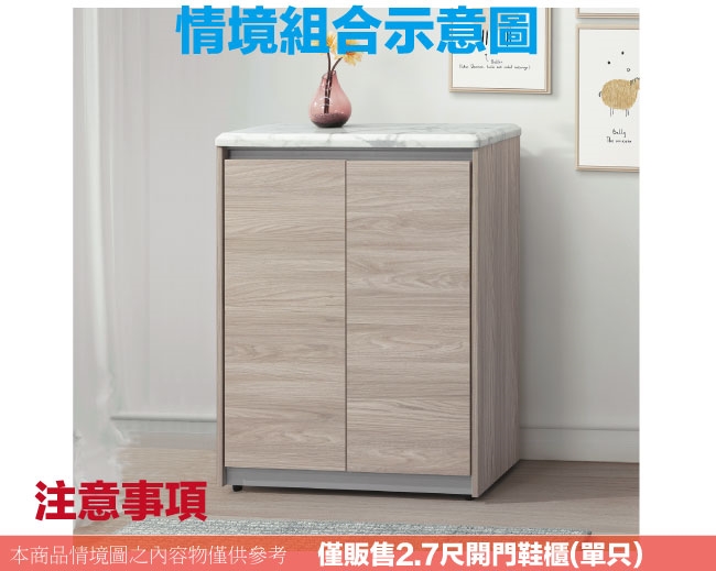 【文創集】路思樂2.7尺二門雙色鞋櫃(仿雲紋石紋木質桌面板) 橡木紋雙色系+現代簡約風格+安心材質製造,使用放心+搭配居家更便利,整體採用防蛀木心板+防潮耐磨腳座+仿雲紋石紋木質桌面板(防潮MDF纖維板)+防夾手緩衝門片五金等材質搭配外層採用優莉坦耐磨全包式噴漆處理 ,採用開門櫃+內開放層格等收納空間設計,全由專人配送到家,專業安心服務,替你省下更多時間!