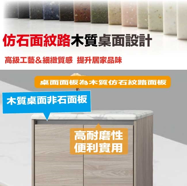 防蛀木心板+防潮耐磨腳座+仿雲紋石紋木質桌面板(防潮MDF纖維板)+防夾手緩衝門片五金等材質