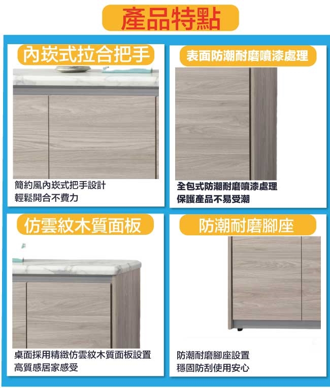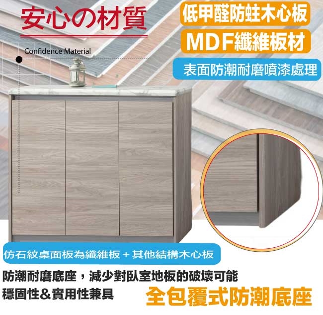 防蛀木心板+防潮耐磨腳座+仿雲紋石紋木質桌面板(防潮MDF纖維板)+防夾手緩衝門片五金等材質