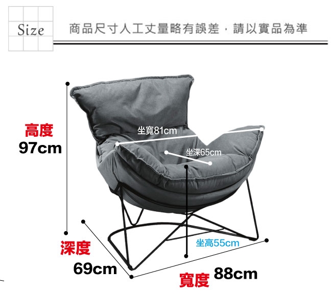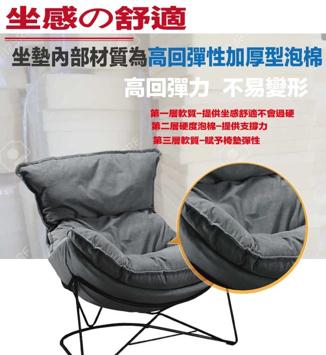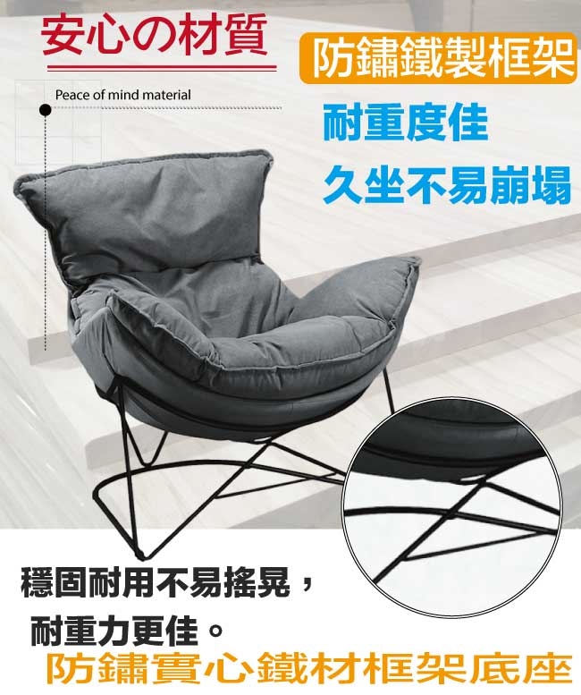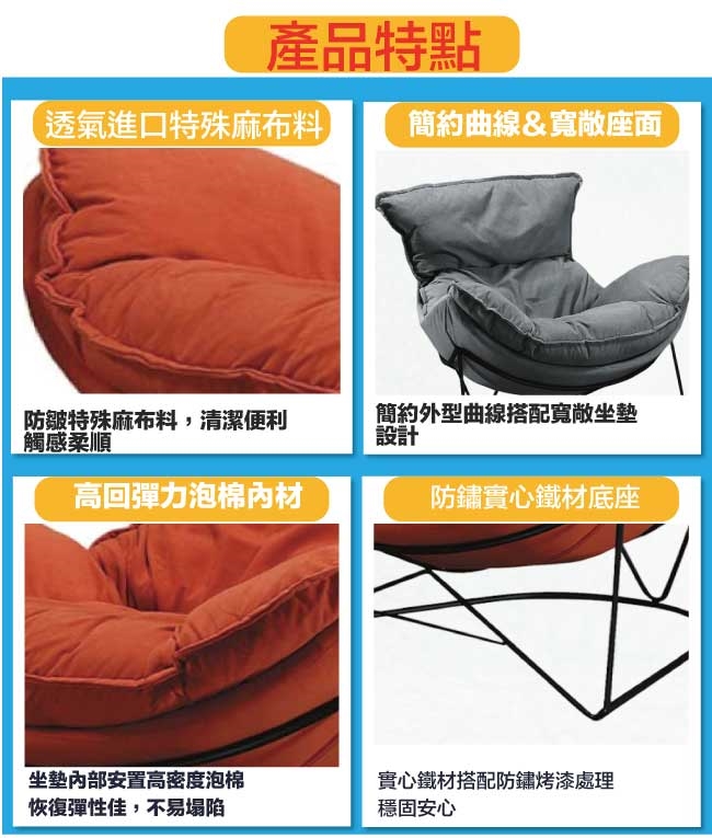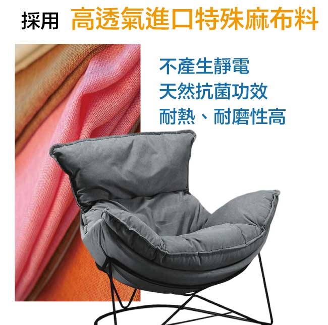 採用防鏽鐵製框架+防鏽實心鐵材底座+進口特殊麻布料+高彈性加厚型泡棉等安心材質製造