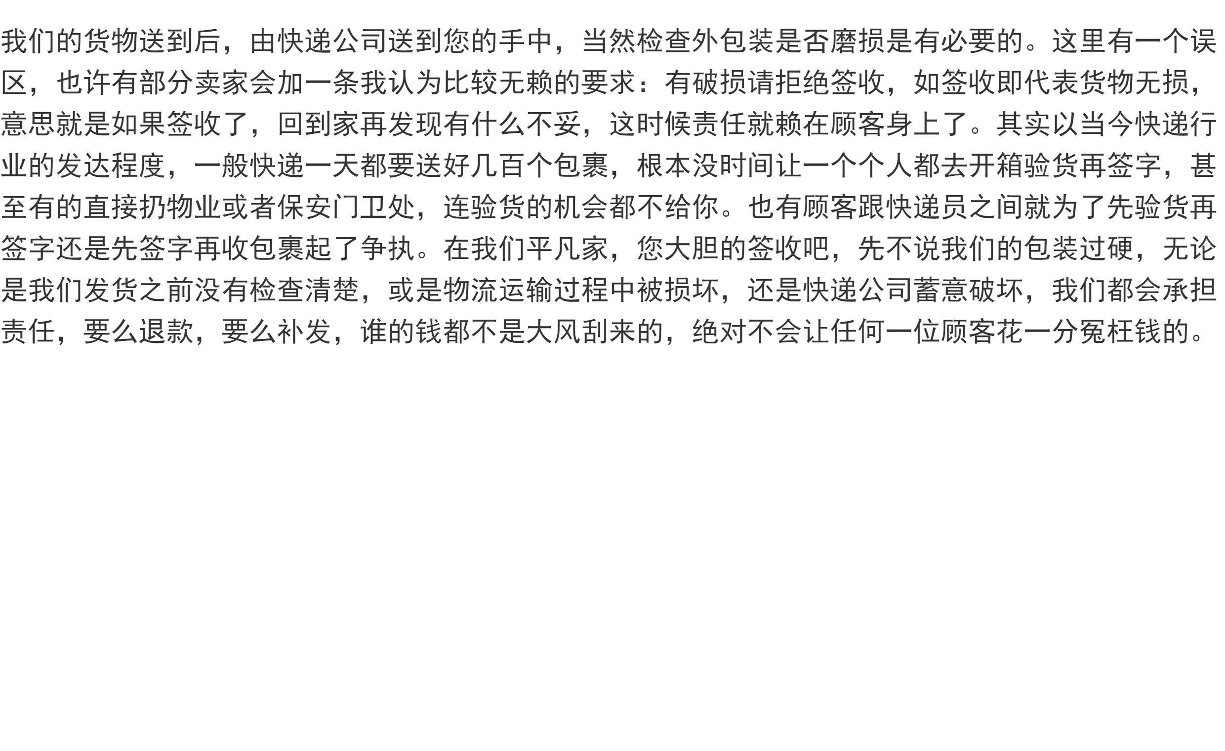 若商品存在瑕疵,請於簽收後7日內提出申請,並提供全程拆封錄影作為依據。商品是否為瑕疵將由廠商最終確認。運輸過程中的輕微碰撞痕跡不影響使用,不屬於瑕疵範疇。 - 拒收包裹的後果