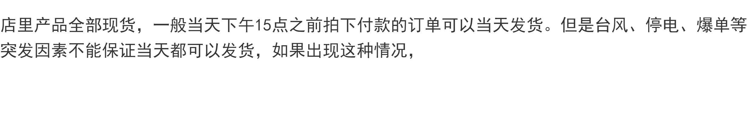 如因不可抗力因素導致商品缺貨或廠商無法出貨,本店保有取消訂單的權利。若訂單部分商品缺貨,由於代購模式採不同廠商個別出貨,部分缺貨無法取消整筆訂單,敬請見諒,商家將為缺貨部分辦理退款處理。無法受理因缺貨要求取消整筆訂單。 - 配送時間與緊急需求