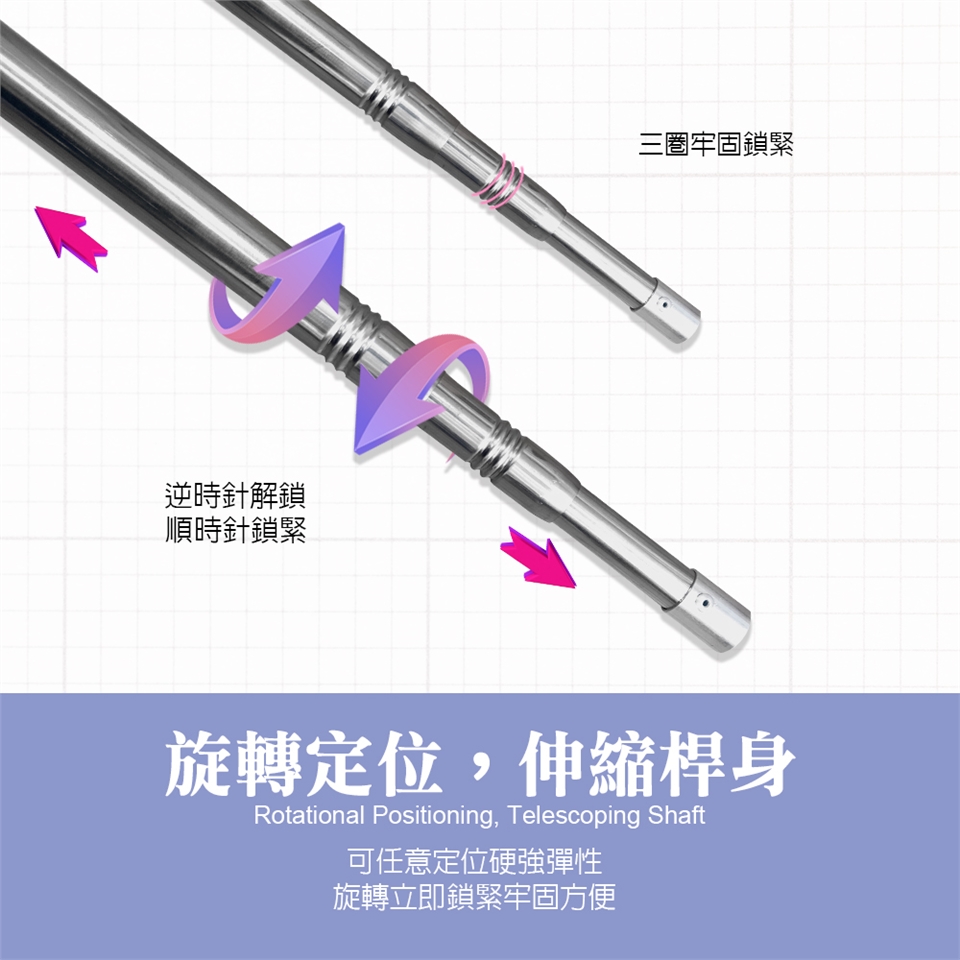 不鏽鋼伸縮桿是一種實用且耐用的家居工具,可以廣泛應用於曬衣/取衣/取物等...日常活動中。這款伸縮桿具有以下特點和功能: