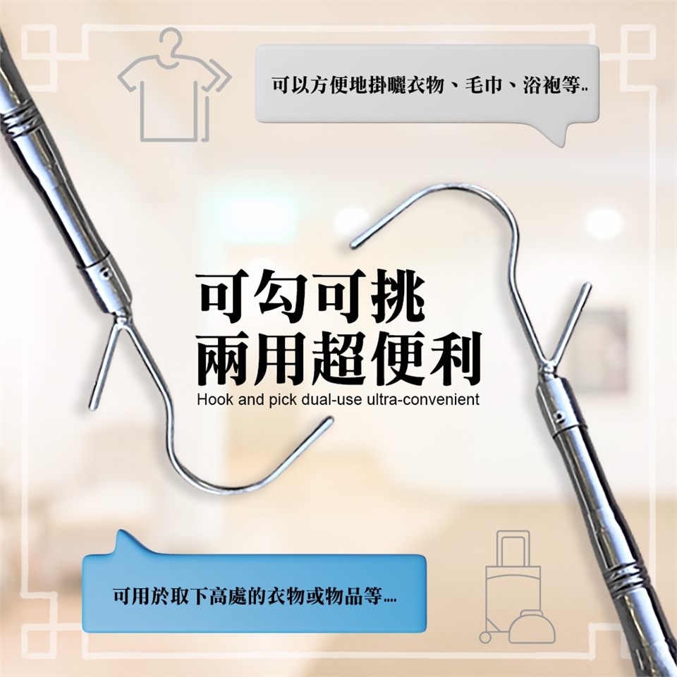 這款伸縮桿配有實心勾和叉,可以方便地掛曬衣物、毛巾、浴袍等..,同時也可用於取下高處的衣物或物品,提供了多種實用功能,使您的日常生活更加便利。
