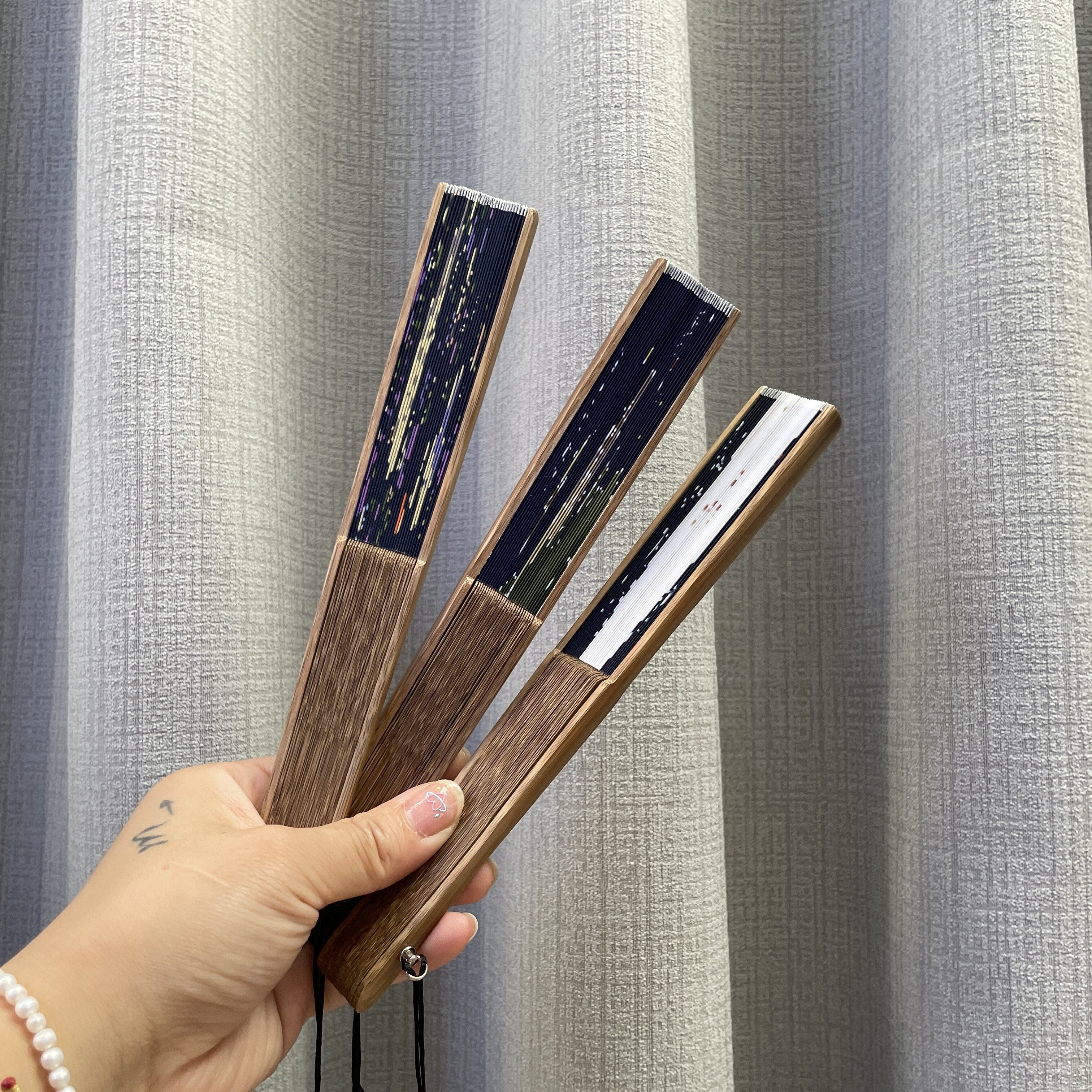 扇面是單面,背面露扇骨,折扇均隨機搭配扇套、流蘇。