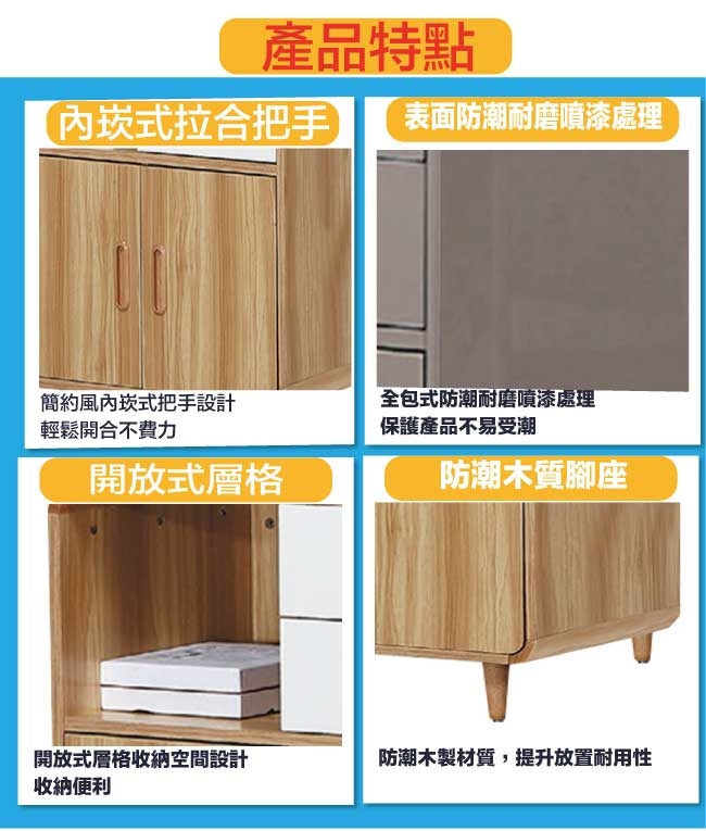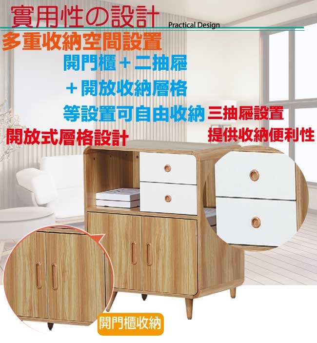 採用開門櫃+二抽屜+開放式空間等收納空間設計