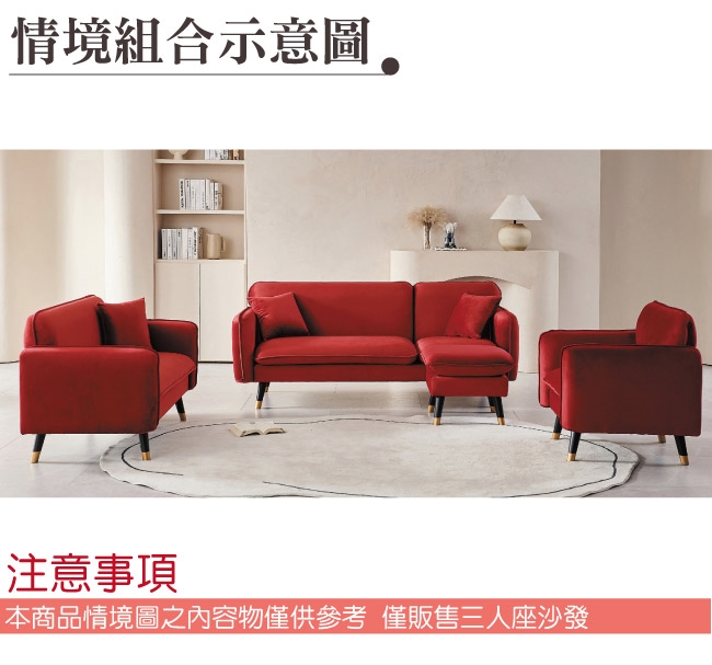 【文創集】邁利希北歐風絨布三人座沙發椅(二色可選) 二色系可選+現代美型外觀+安心材質設計,就是這種頂級質感的設計,能輕鬆地融入各種空間風格,採用實木骨架椅身+實木腳座&防鏽金漆腳套+高質感進口絨布料+高回彈性加厚泡棉等安心材質製造,品質安心有保障,現在購買專人送到府服務,免組裝+免運費,讓你省時省力省運費!