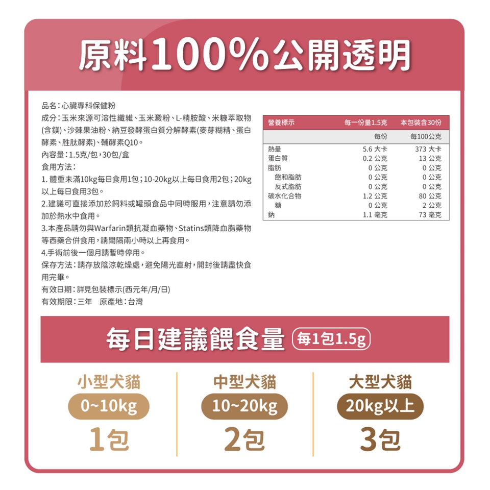 因為心臟專科保健粉成份是天然萃取,從幼年開始,可以就毛孩可能會遇到的問題開始保養心臟,透過心臟專科保健粉維持心臟健康。
