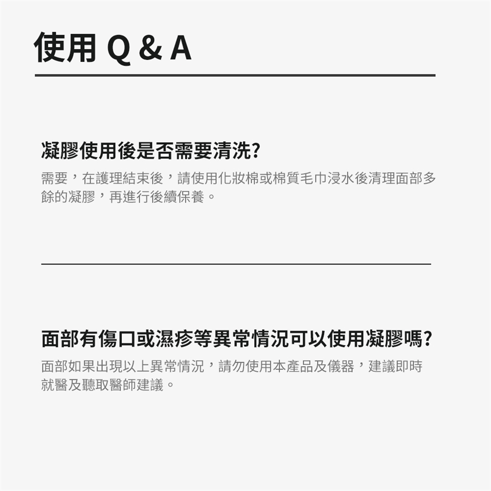 1. 臉部有傷口、腫塊、溼疹等肌膚異常情況下請勿使用,建議諮詢醫師。