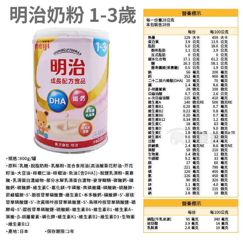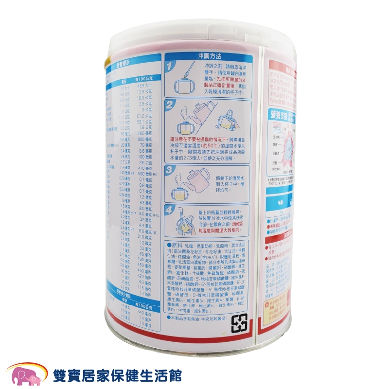 •原料:乳糖、脫脂奶粉、乳酪粉、混合食用油(高油酸葵花籽油、芥花籽油、大豆油、棕櫚仁油、棕櫚油、魚油[含DHA])、脫鹽乳清粉、果寡酸、乳清蛋白濃縮物、部分水解乳清蛋白濃物、麥芽糊精、碳酸鈣、磷酸鈣、碳酸鉀、維生素C、氯化鎂、牛磺酸、焦磷酸鐵、磷酸鈉、硫酸鋅、菸鹼醯胺、5'-胞核苷單磷酸鹽、維生素E、本多酸鈣、磷酸鉀、5'-尿核苷單磷酸鹽、5'-次黃嘌呤核苷單磷酸鹽、5'-鳥嘌呤核苷單磷酸鹽、硒酵母、5'-腺核苷單磷酸鹽、硫酸銅、維生素B6、維生素B1、維生素A、葉酸、β-胡蘿蔔素、碘化鉀、維生素K1、維生素B2、維生素D3、生物素、維生素B12