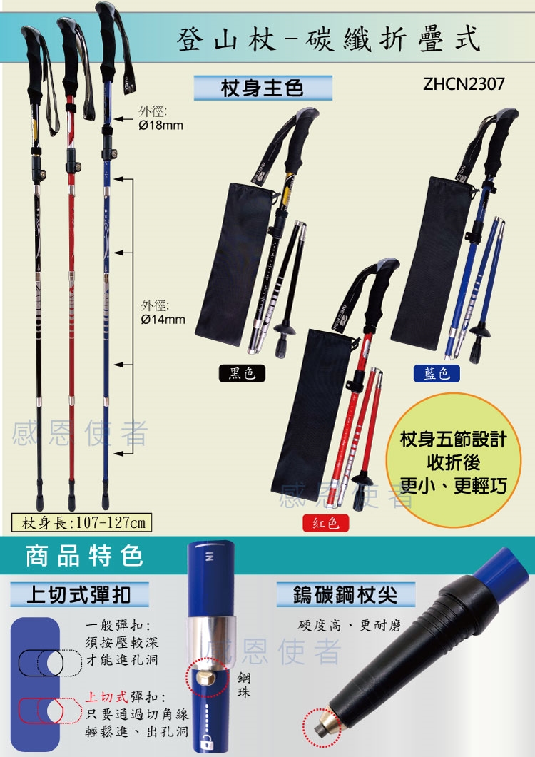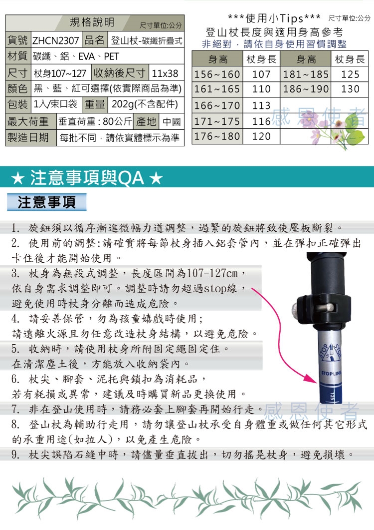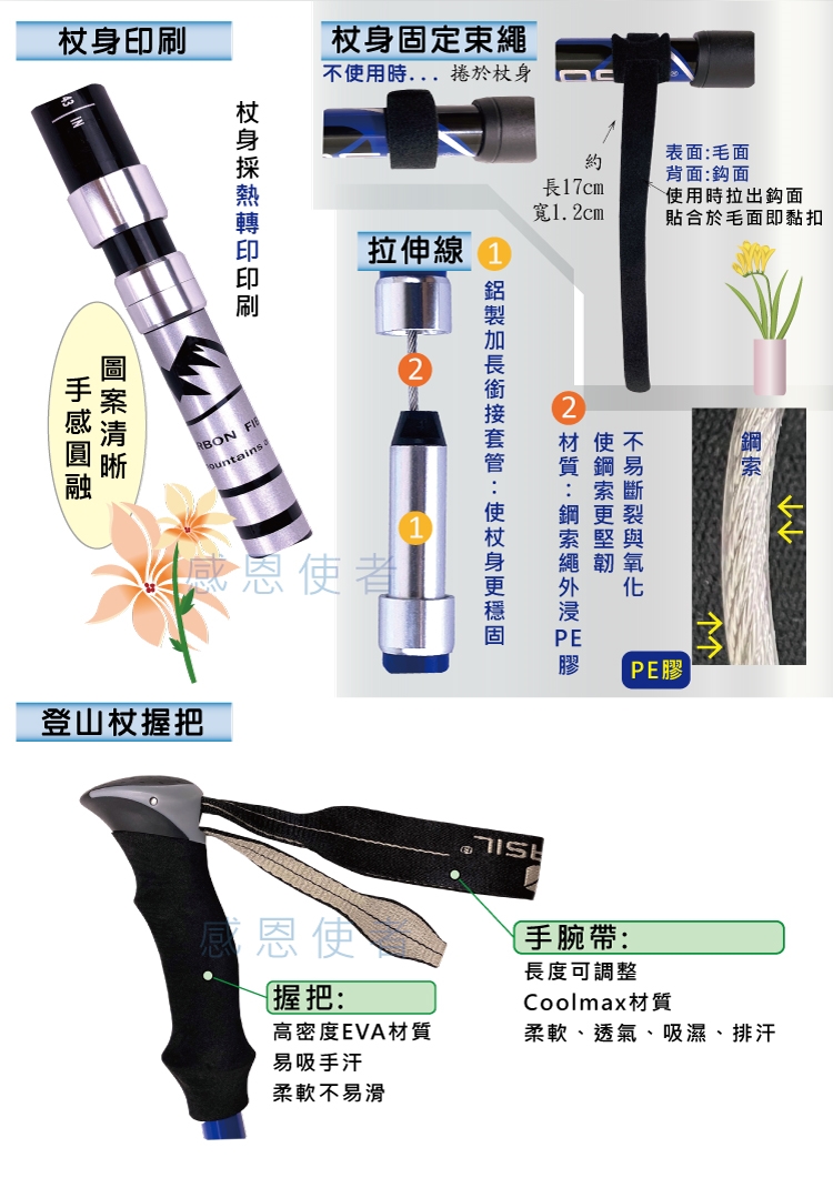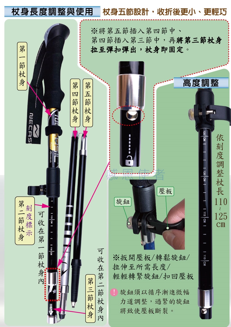 8. 登山杖為輔助行走用,請勿讓登山杖承受自身體重或做任何其它形式