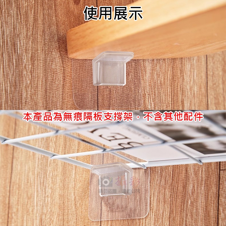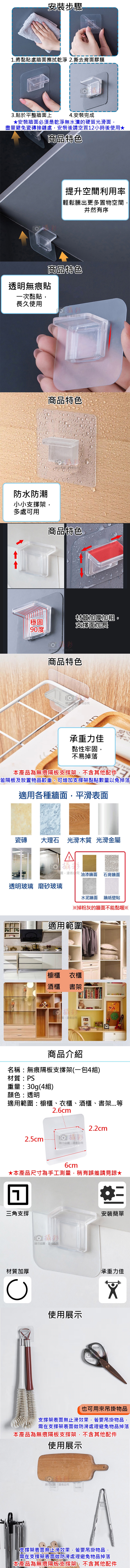 3.單個承重約2kg,因受力面積及位置不同,累加使用承重亦有所不同,若隔板及放置物品較重,可增加支撐架黏貼數量以免掉落。