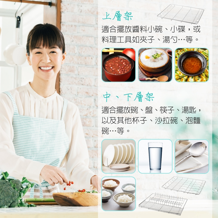三層304不鏽鋼碗盤放置空間,碗盤分層,讓您靈活運用