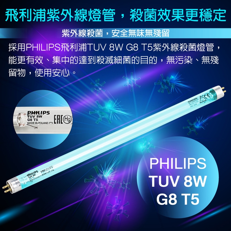 採用飛利浦TUV 8W G8 T5紫外線殺菌燈管,無污染、無殘留物更有效達到滅菌目的