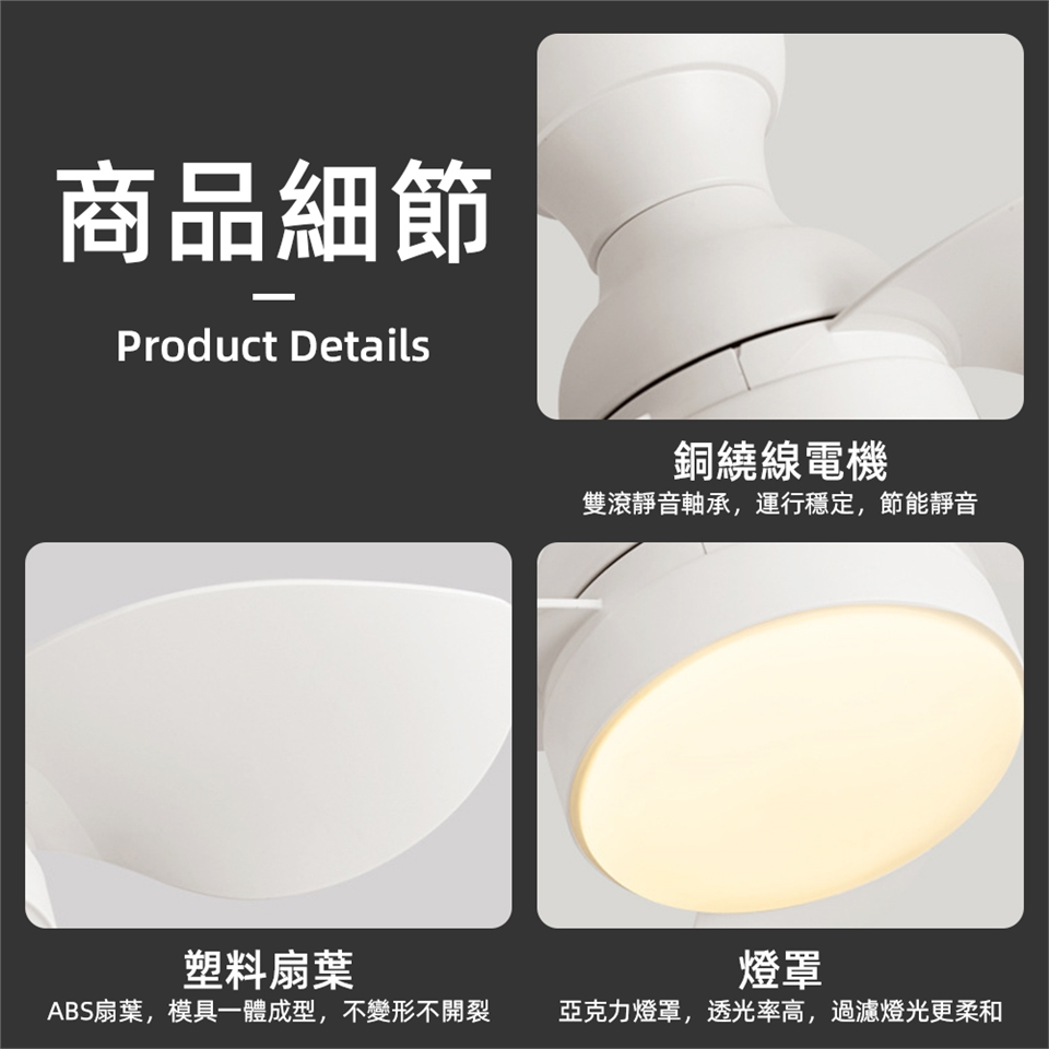 產品特色:遠程遙控,多檔調速,智能定時,銅線電機,三色變光,靜音節能