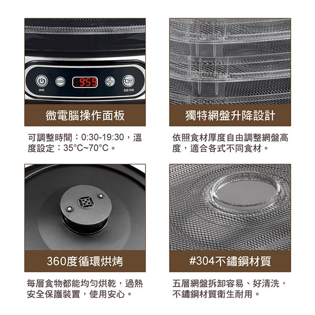 ◎五層可拆卸升降網架,耐用、容易清洗。