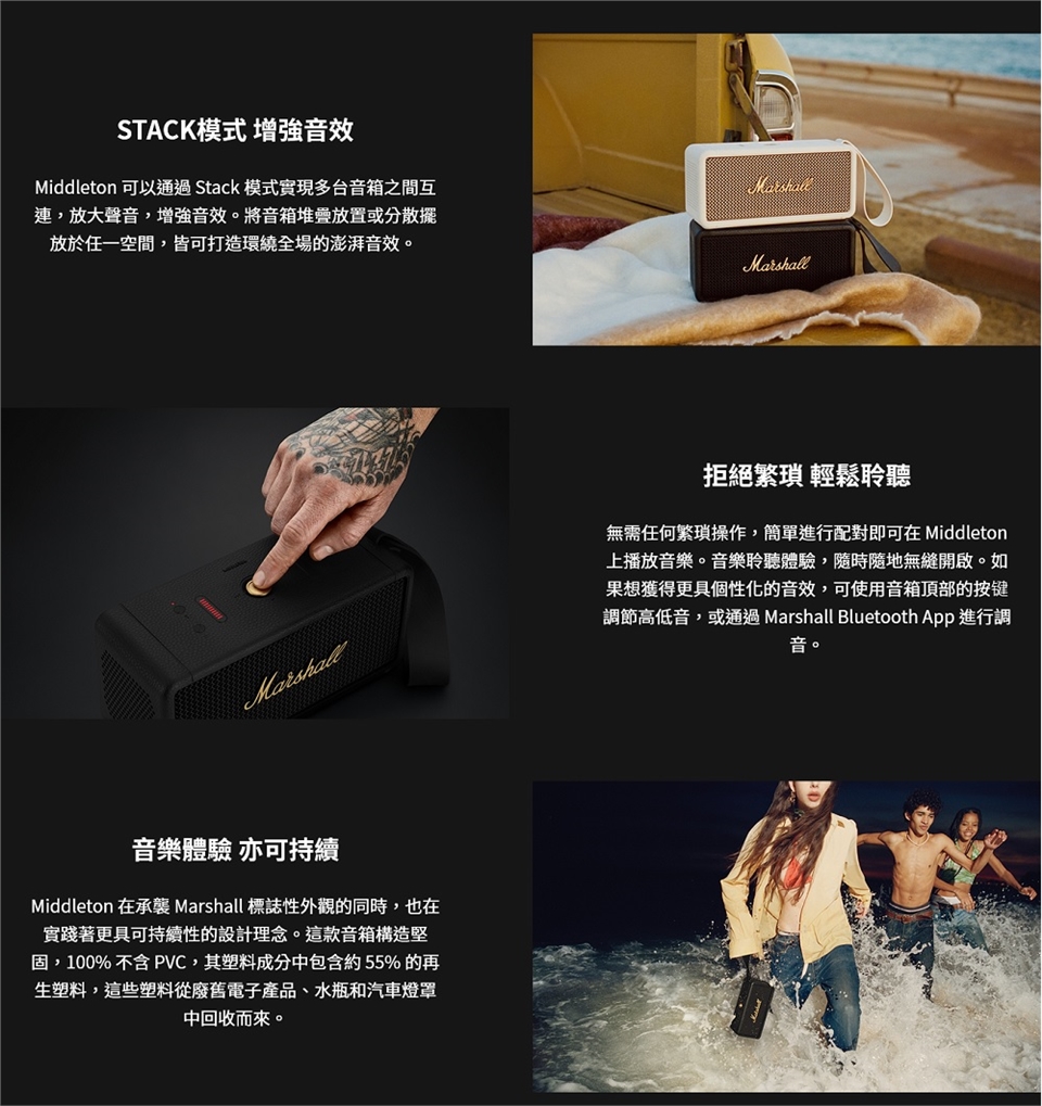 頂部控制面板: 多向控制按鈕 - 播放/暫停曲目、跳過曲目、音量控制、電源開/關 藍牙配對按鈕 - 用於連接設備與開啟Stack模式 電池與音量指示燈 高低音調節按键