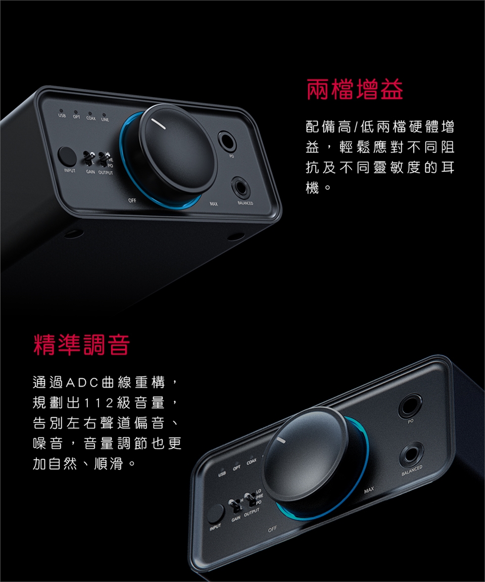 精準調音 | 通過ADC曲線重構,規劃出112級音量,告別左右聲道偏音、噪音,音量調節也更加自然、順滑。