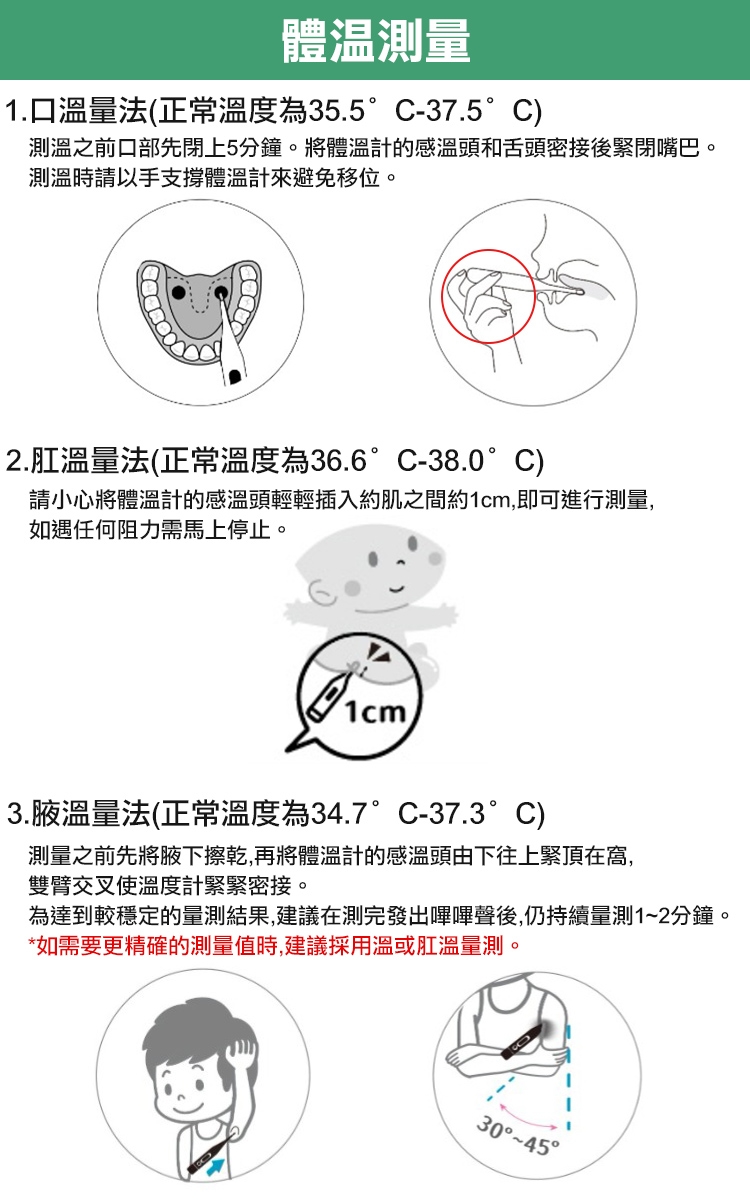 *此種量測方式易受到體溫計感溫頭的擺放位置及汗液影響,因此,如需要更精確的測量值時,建議採用溫或肛溫量測。