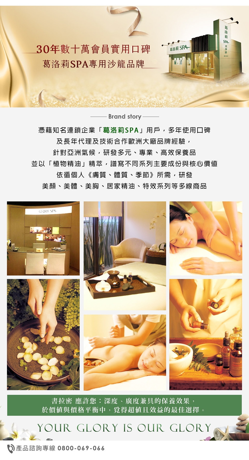 Since1993,葛洛莉SPA美學館目前於全省擁有17家實體門市,我們以恬靜、優雅、智慧風貌,從容立身於都會之中,營運30年來,研發各式獨家手技,搭配天然植物精油精萃產品,用心服務每位渴求被寵愛呵護的女性身心靈。