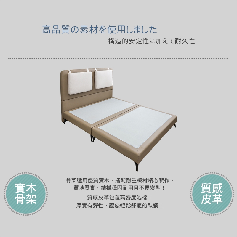 質感皮革包覆高密度泡棉,厚實有彈性,讓您輕鬆舒適的臥躺!