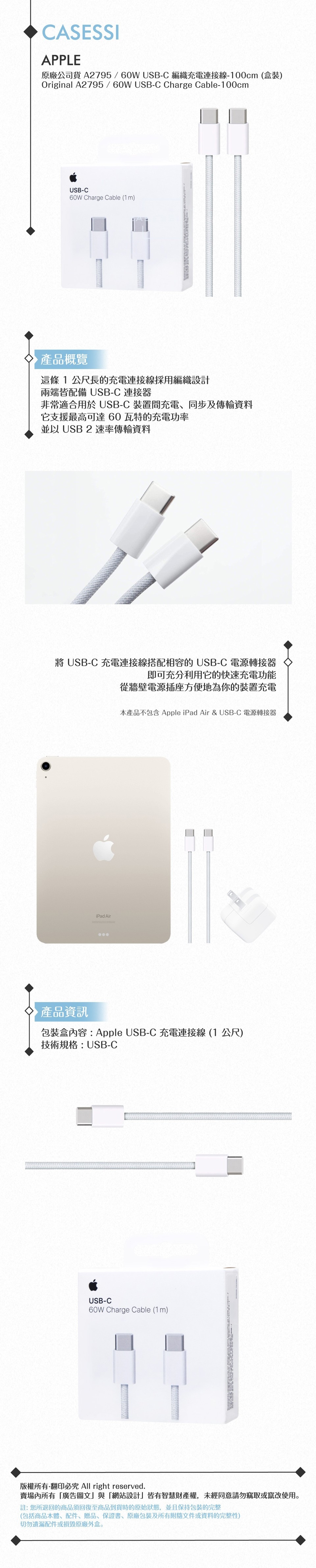 這條 1 公尺長的充電連接線採用編織設計,兩端皆配備 USB-C 連接器,