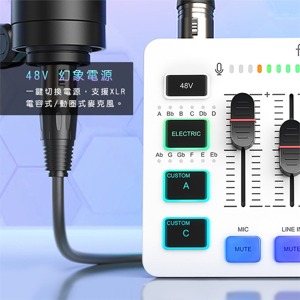 一鍵切換電源,支援XLR電容式/動圈式麥克風。