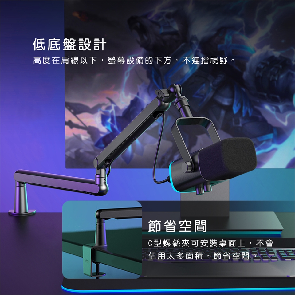 懸臂上的麥克風支架通用3/8"和5/8"螺紋,適用市面上大部分的麥克風。