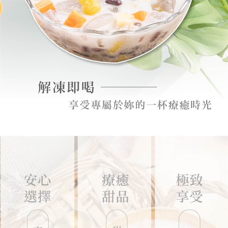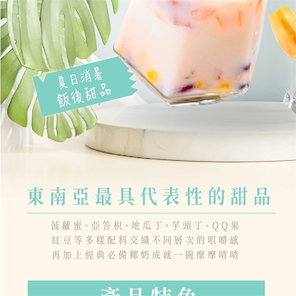 精選富有特殊香氣南洋菠蘿蜜,搭配透明軟Q亞答枳,以及地瓜丁、芋頭丁、QQ果、紅豆,最後加上香濃滑順椰漿,滿滿異國風情的夏日消暑甜品