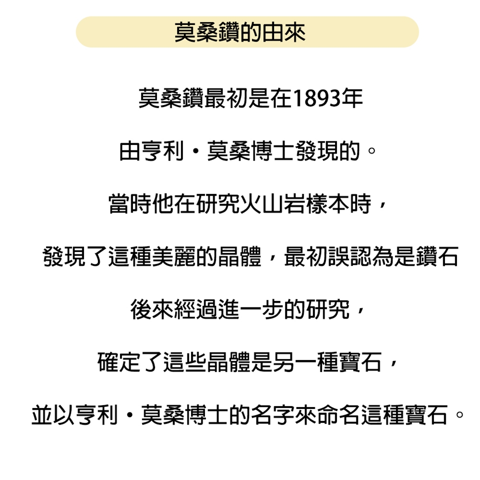 莫桑石最初是在1893年由亨利·莫桑發現的。當時他在研究火山岩樣本時,發現了這種美麗