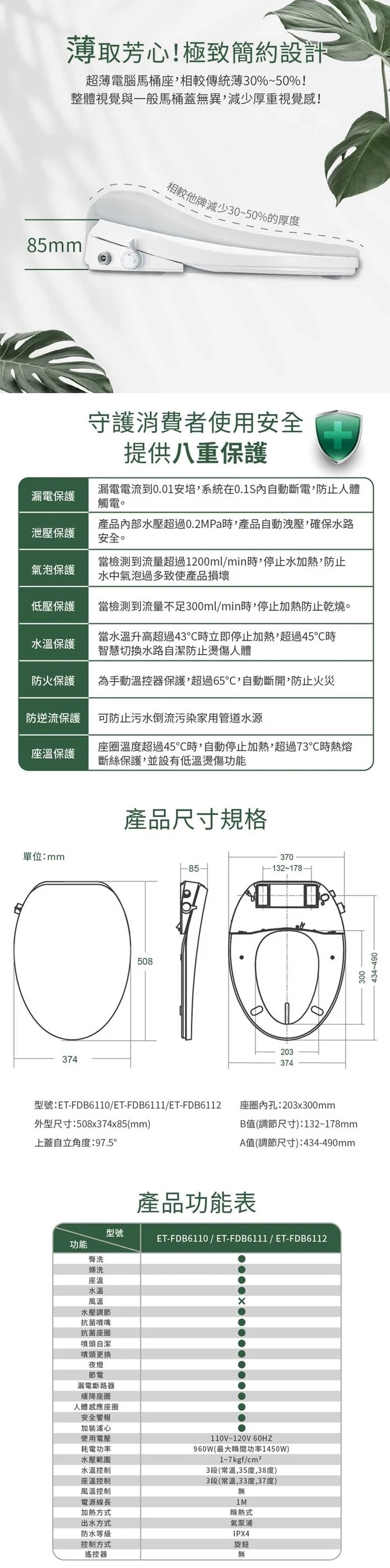 ◆ 型號:ET-FDB6110(微電腦馬桶座)X1入