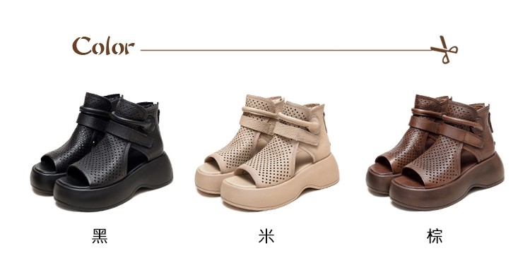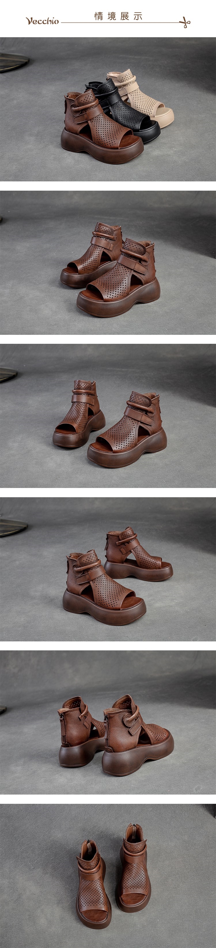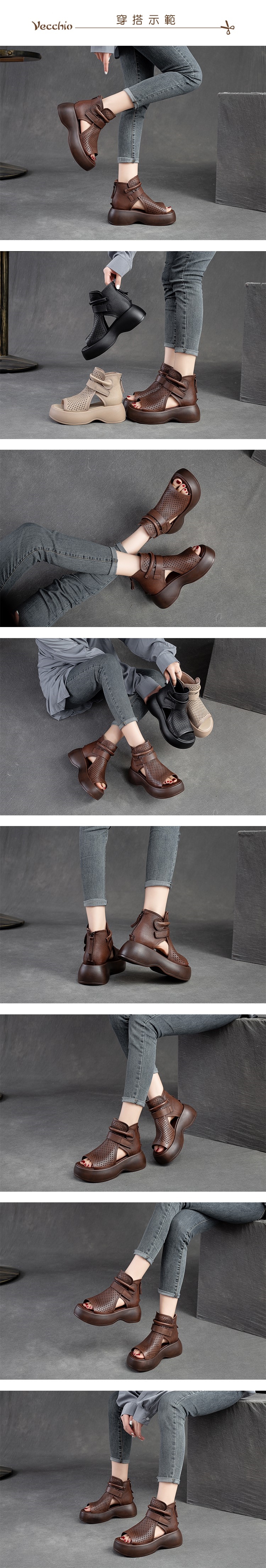 【VECCHIO】涼鞋 羅馬涼鞋/全真皮頭層牛皮縷空透氣魚口露趾復古厚底羅馬涼鞋 棕