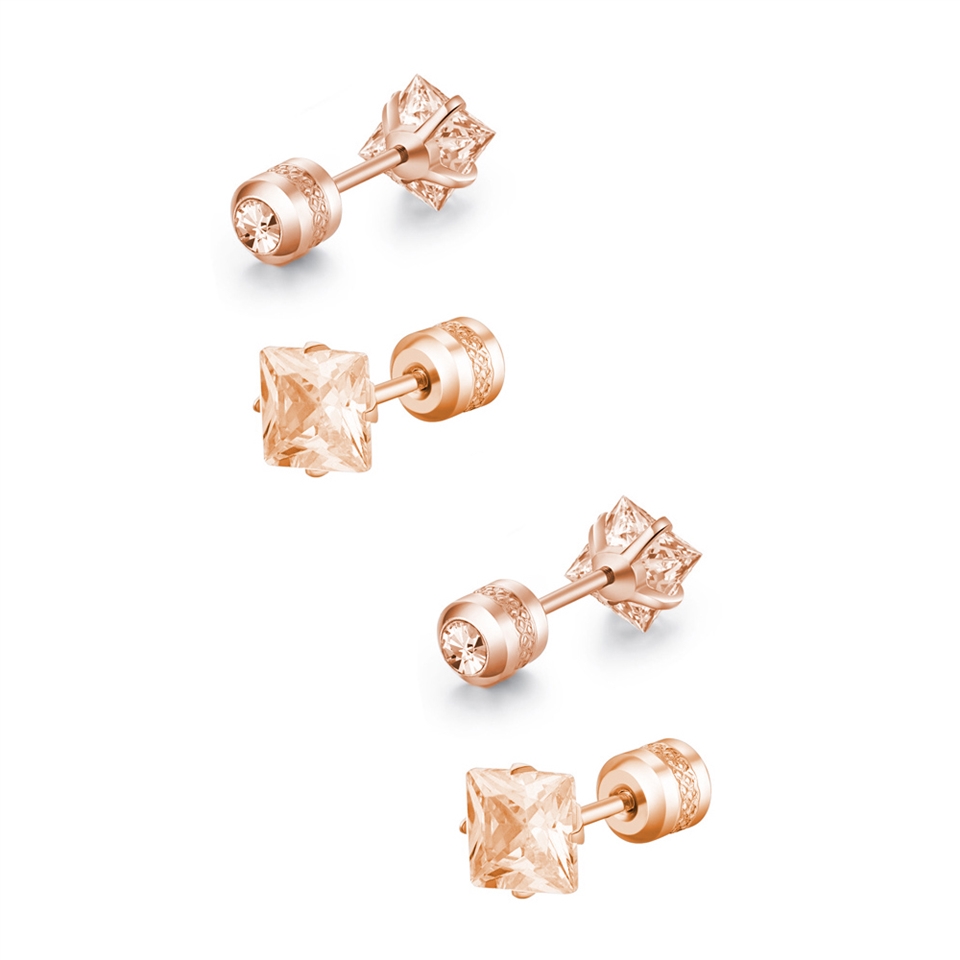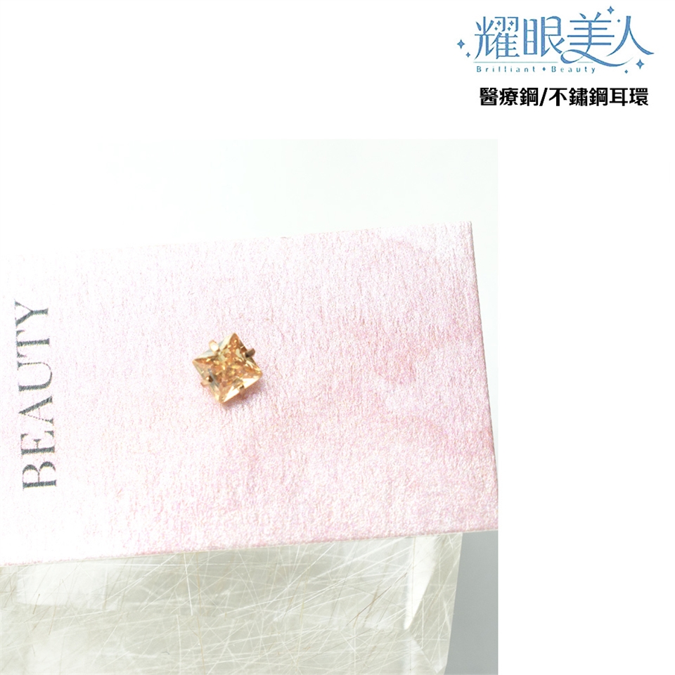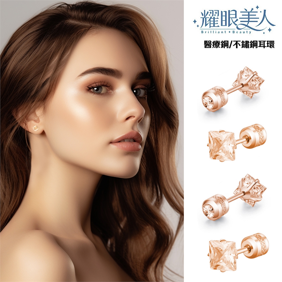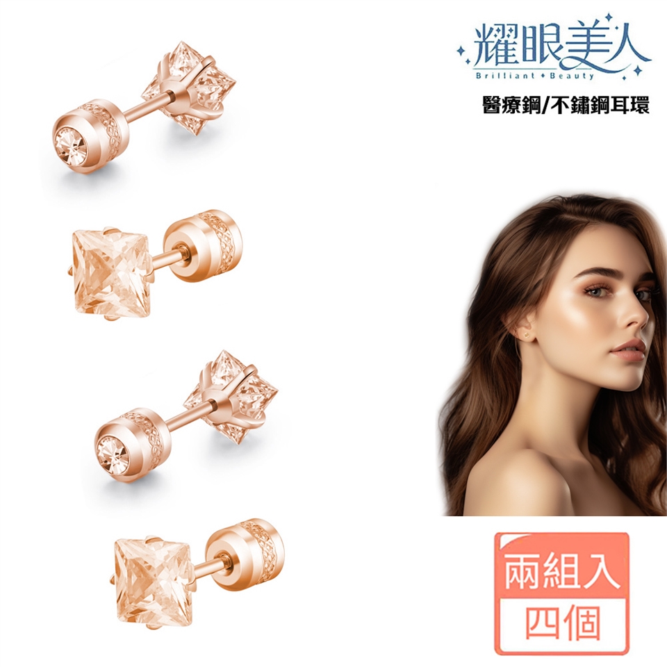 【耀眼美人】閃耀公主方玫瑰金香檳鋯石50分醫療鋼不鏽鋼耳環兩組入(耳環/造型/過爐款/美容美感品味)