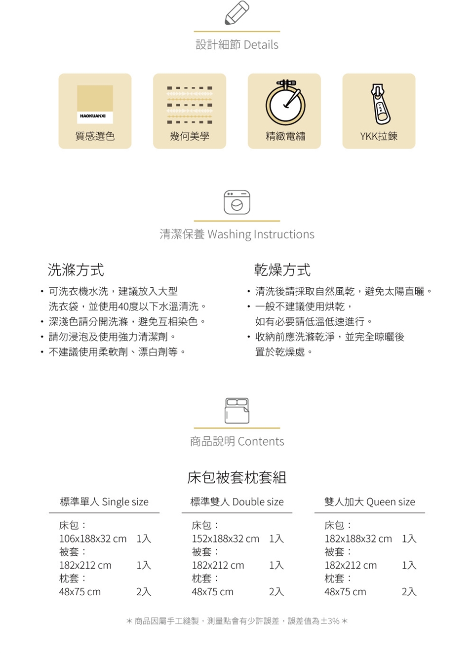 ‧ 請勿浸泡床寢及使用強力清潔劑,不建議使用柔軟劑、漂白劑等。