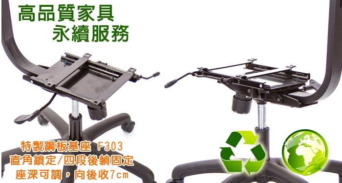 本款坐墊底盤使用F303懸吊分離式滑型鋼板基座,可四段後躺固定,依自己喜好故定角度,或不固定隨時可彈力後躺雙功能;懸臂機構在後躺時,座墊會同步傾斜,重心平穩,防止翻倒。