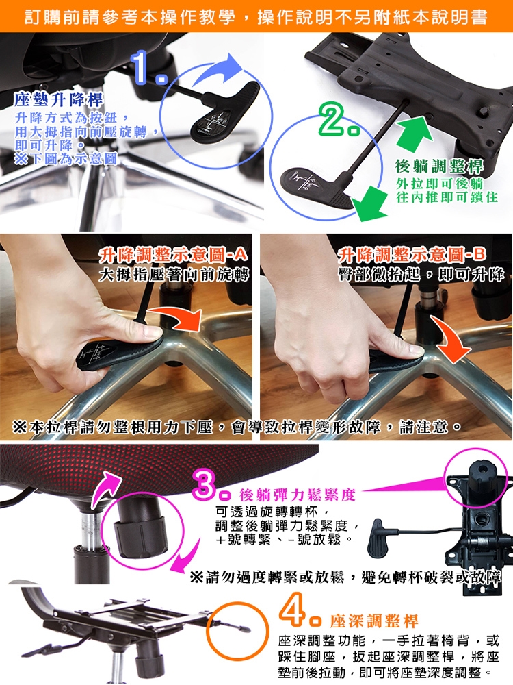 1.座椅高度︰調整高度時,人請先離開座墊,在將拉桿向前旋轉下扳,即可將座墊昇起,若需調降高度,人則需坐在座墊上,在將拉桿下扳,透過身體重量,座面高度即可下降。