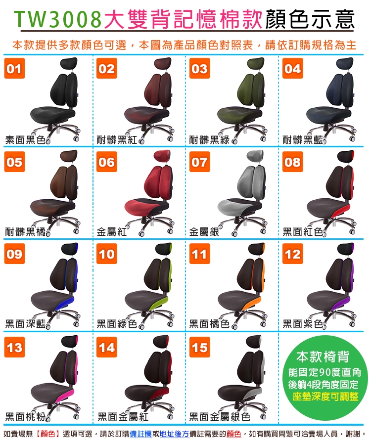 椅背可固定90度或彈力後仰式,多款造型、多功能扶手可選,