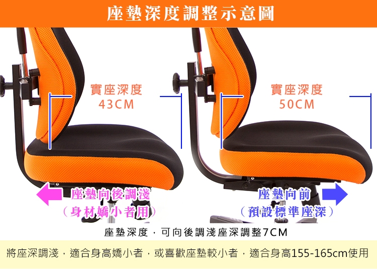 本款TW-3008坐墊可調整坐墊深度,能向後縮短座深7cm間距,實座深度50CM,可縮淺至43CM,適合身高155~190CM以 下,縮短座深讓身材嬌小使用上更加舒適,或是給喜好短座深的使用者(適合短腿族群的座椅)。