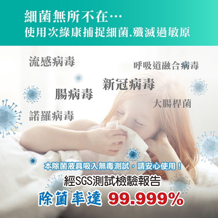 A:次綠康清潔液主成分為食鹽,PH屬就是弱鹼性次氯酸水,其優點就是低殘留,其還原的特性,故無法永久保持清潔效果,需重覆噴灑以形成持續清潔效果,另外也有其效期之限制。