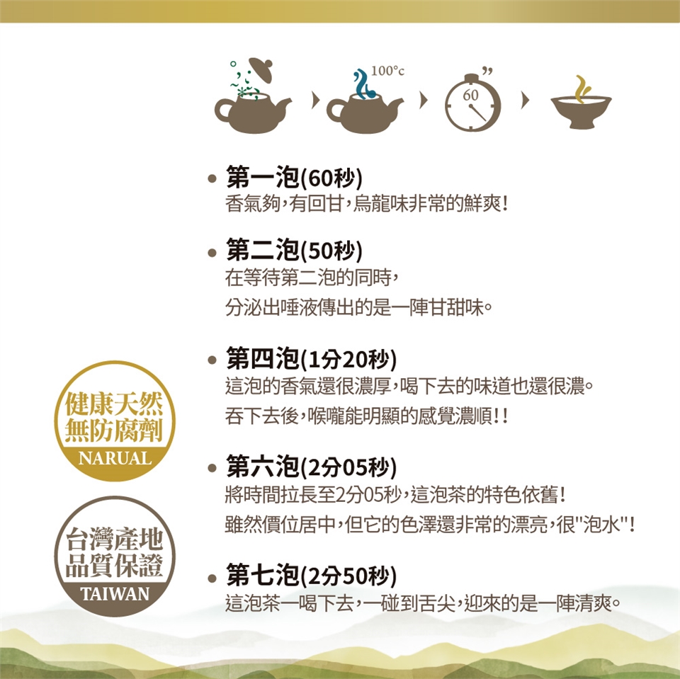 將茶放入茶壺中(茶與比例約1:40),注入100度的沸水,先溫壺(洗查)2~3秒更能揚香,第一泡60秒後出水鮮爽回甘,超好喝!