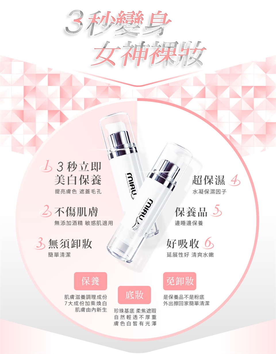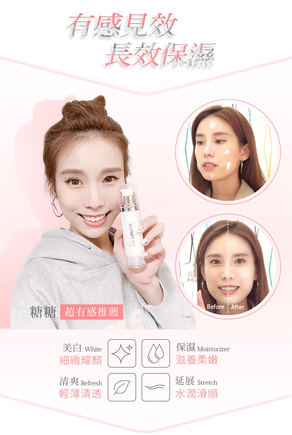 白天:臉部清潔保養程序完成後,可當隔離霜使用,均勻塗抹至臉部肌膚後在繼續其他底妝部驟後續上妝即可 。