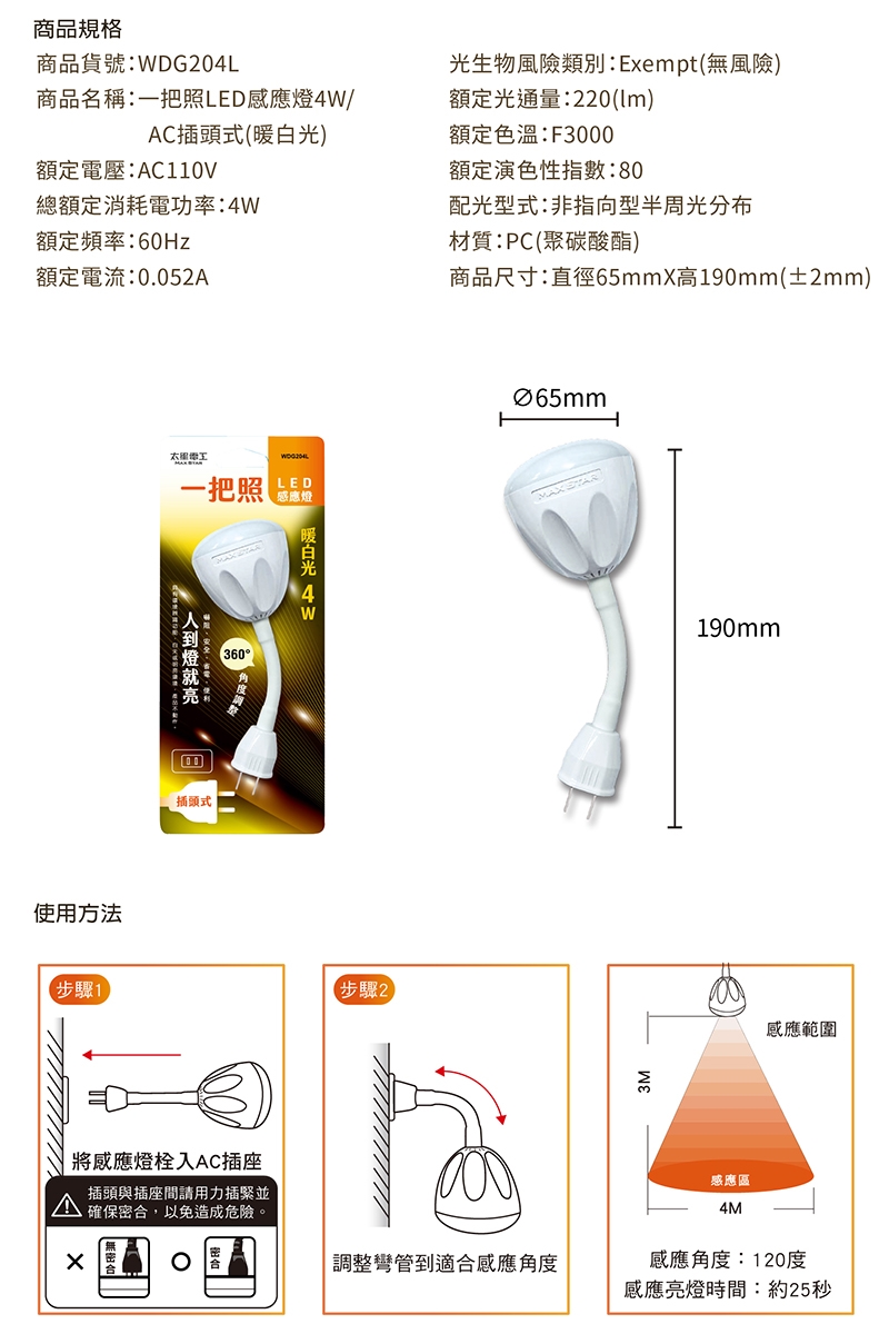6.此產品不適用安裝於燈罩或備有調光燈具使用。
