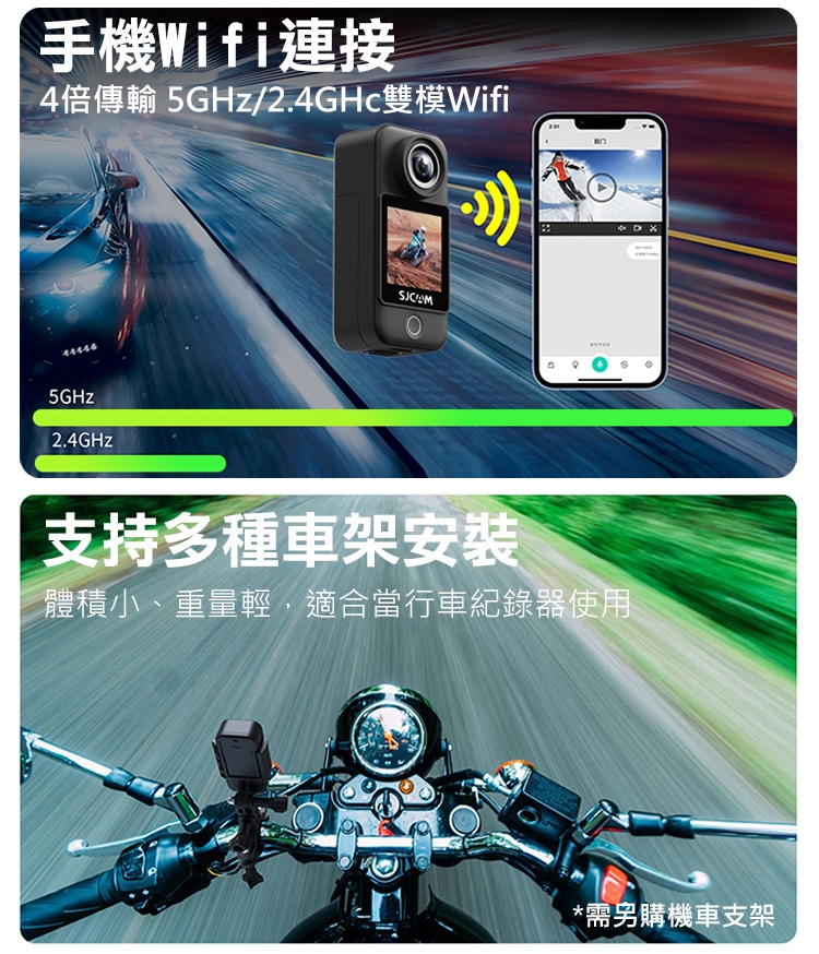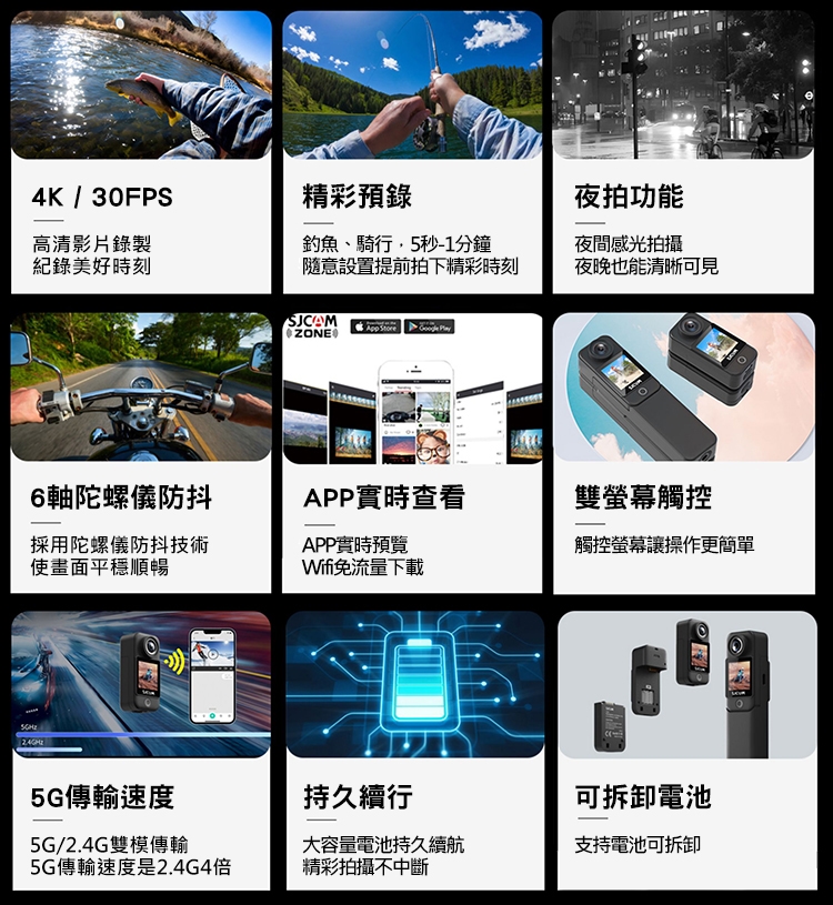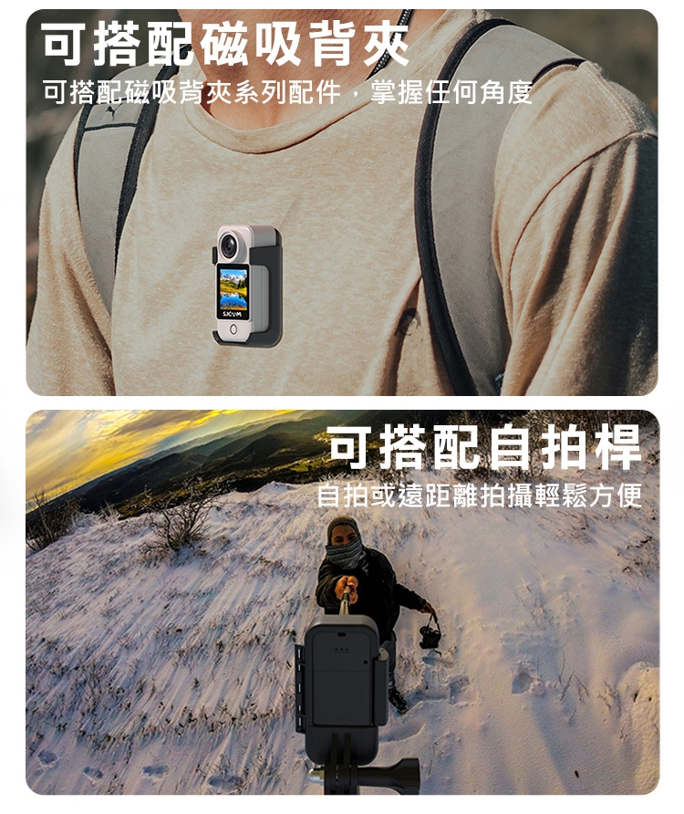 .產品內容:C300主機(含1000mAh電池) X1、2800mAh手持電池 X1、防水殼 X1、邊框 X1、支架 X1、背夾 X1、平行底座 X1、螺絲 X1、掛繩 X1、頭盔底座 X2、3M貼紙 X2、數據線 X1、擦拭布 X1、SJCAM貼紙 X1、說明書 X1