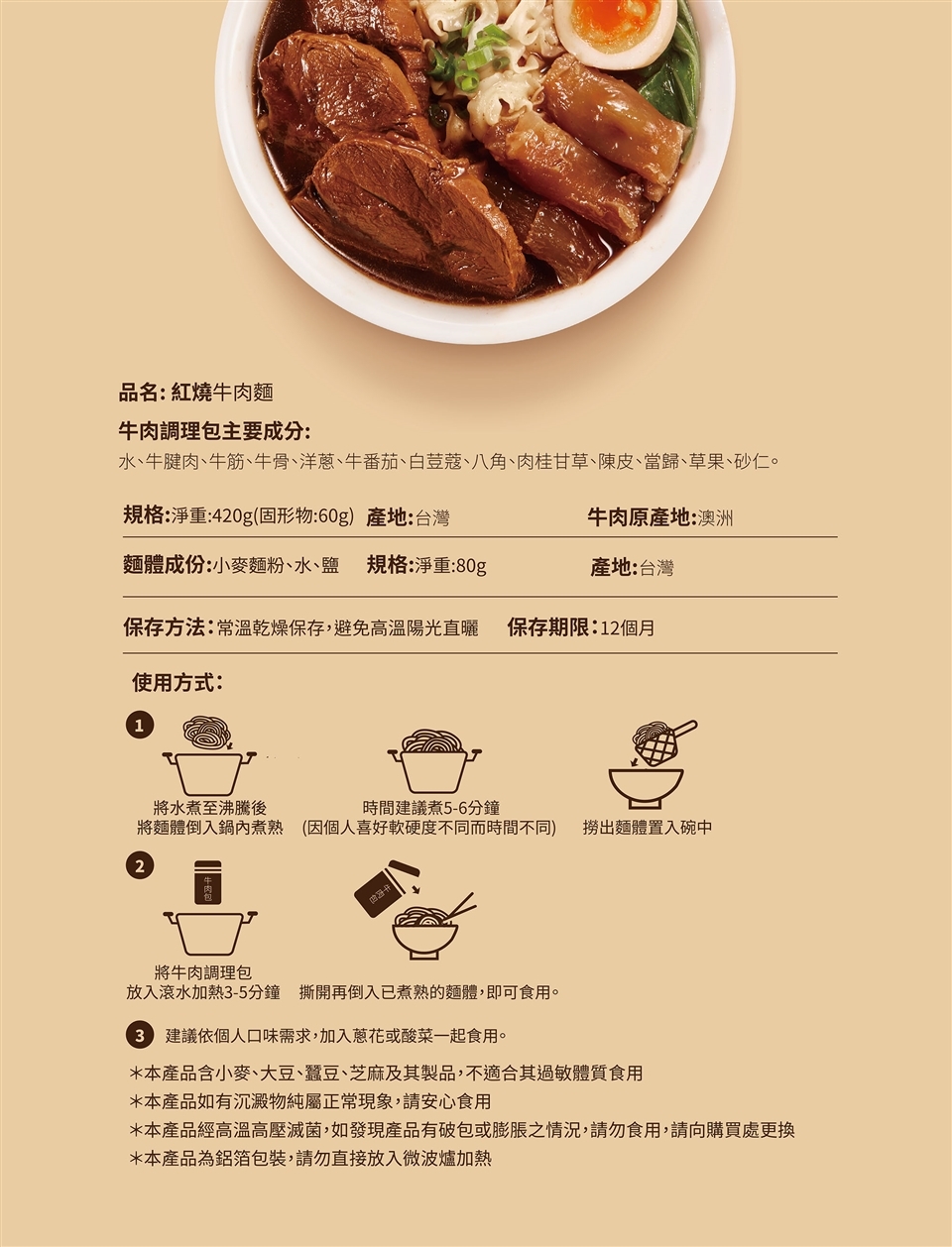 2.將牛肉料理包隔水加熱3-5分鐘,撕開再倒入已煮熟的麵體,即可食用。